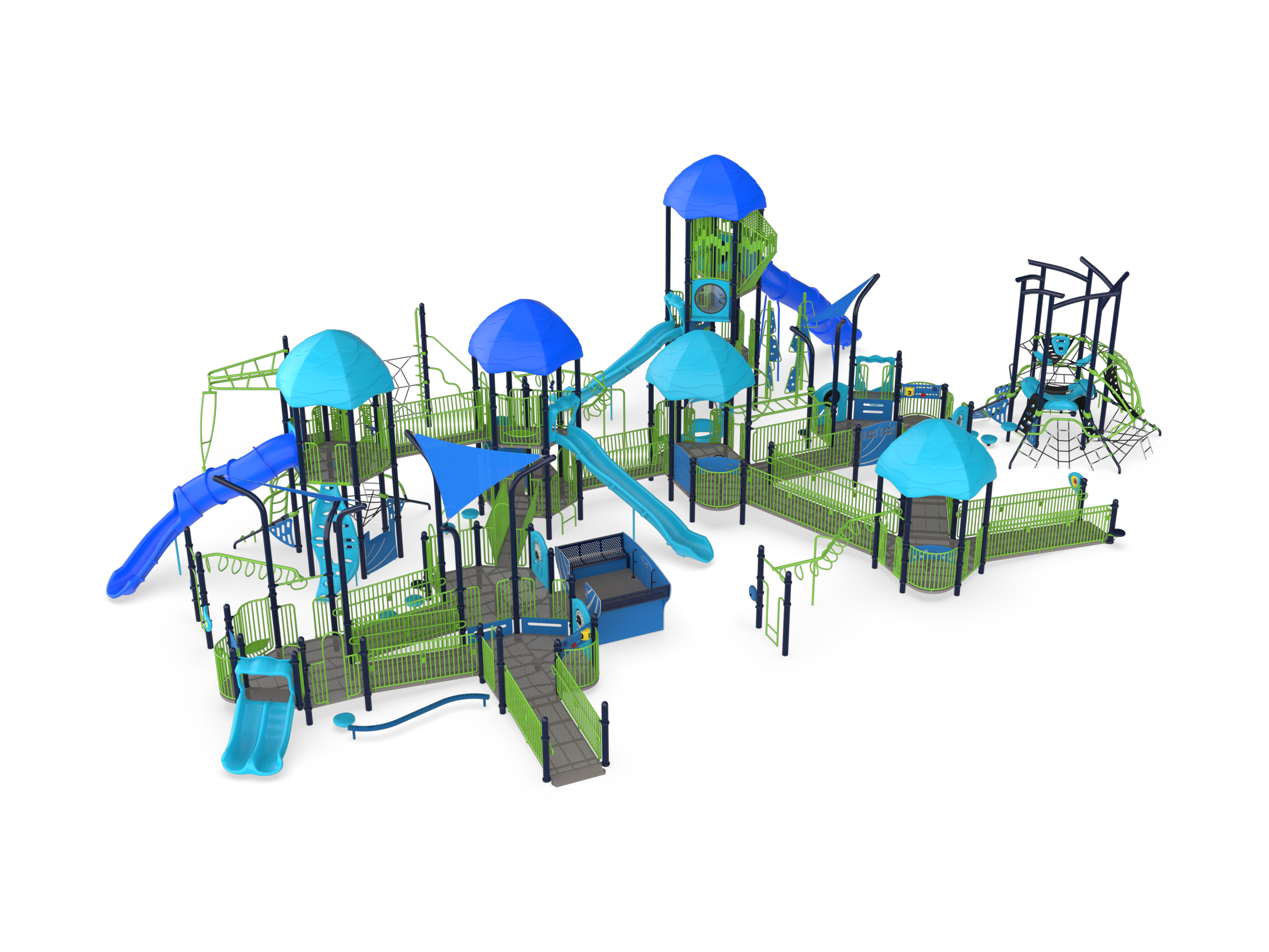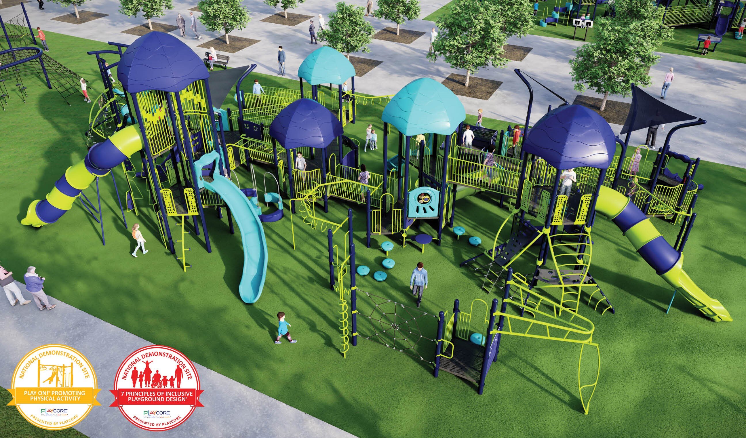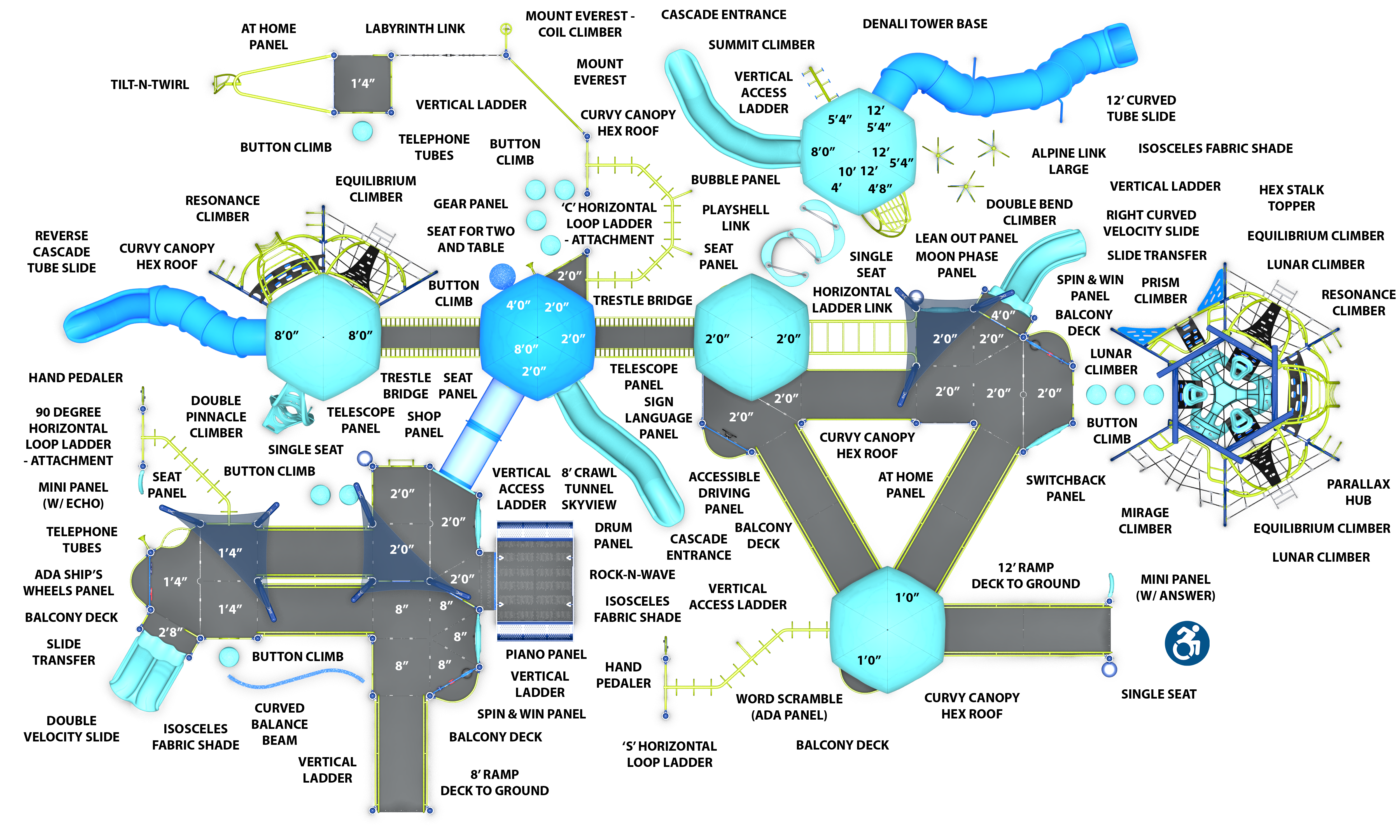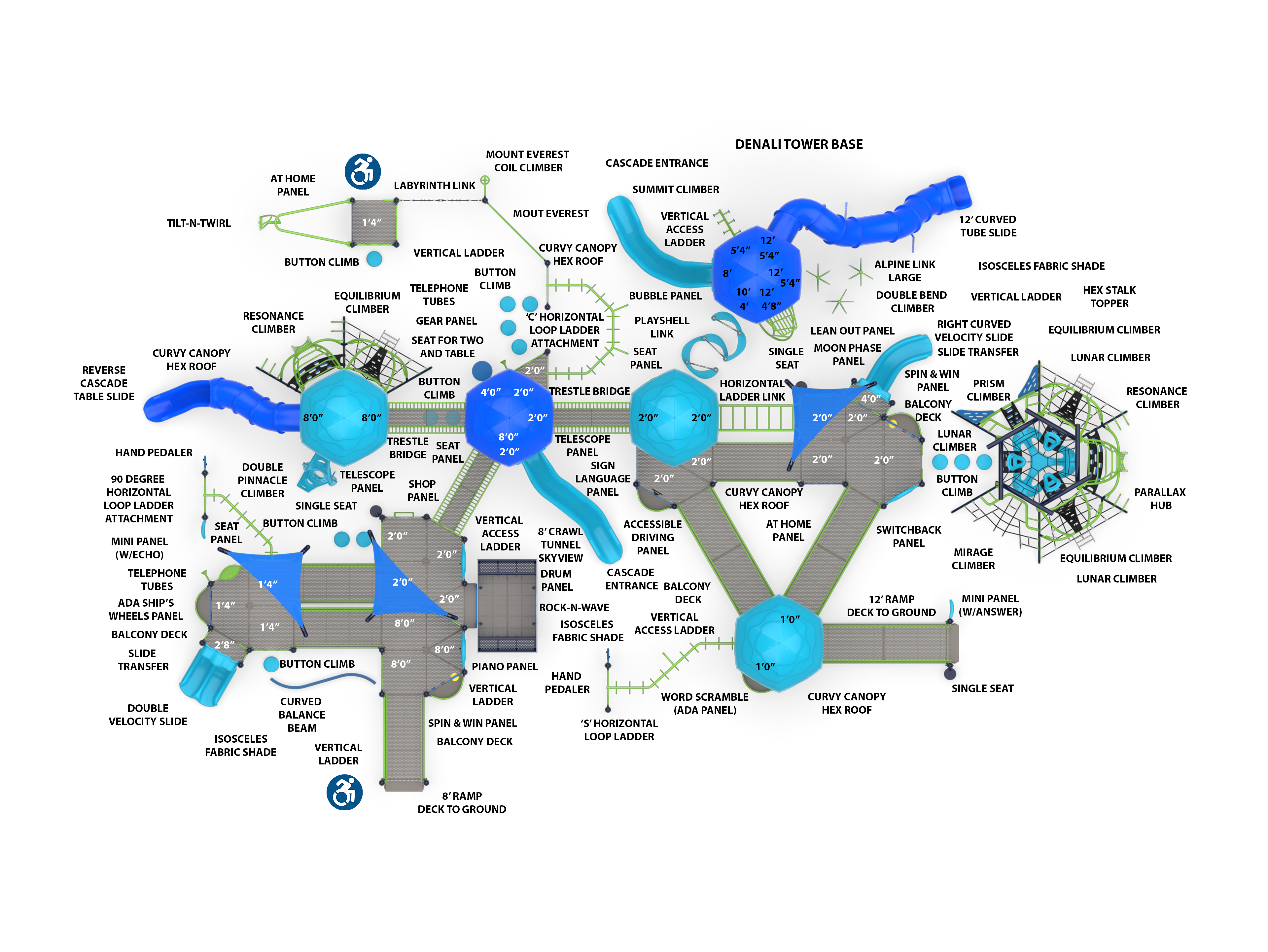 Anchored by a Denali Tower and a Parallax Ascent, the Enchanted Grove features over 60 play activities scattered around a rambling, inclusive pathway. Designed for children aged 5-12, this play structure qualifies for two NDS designations.