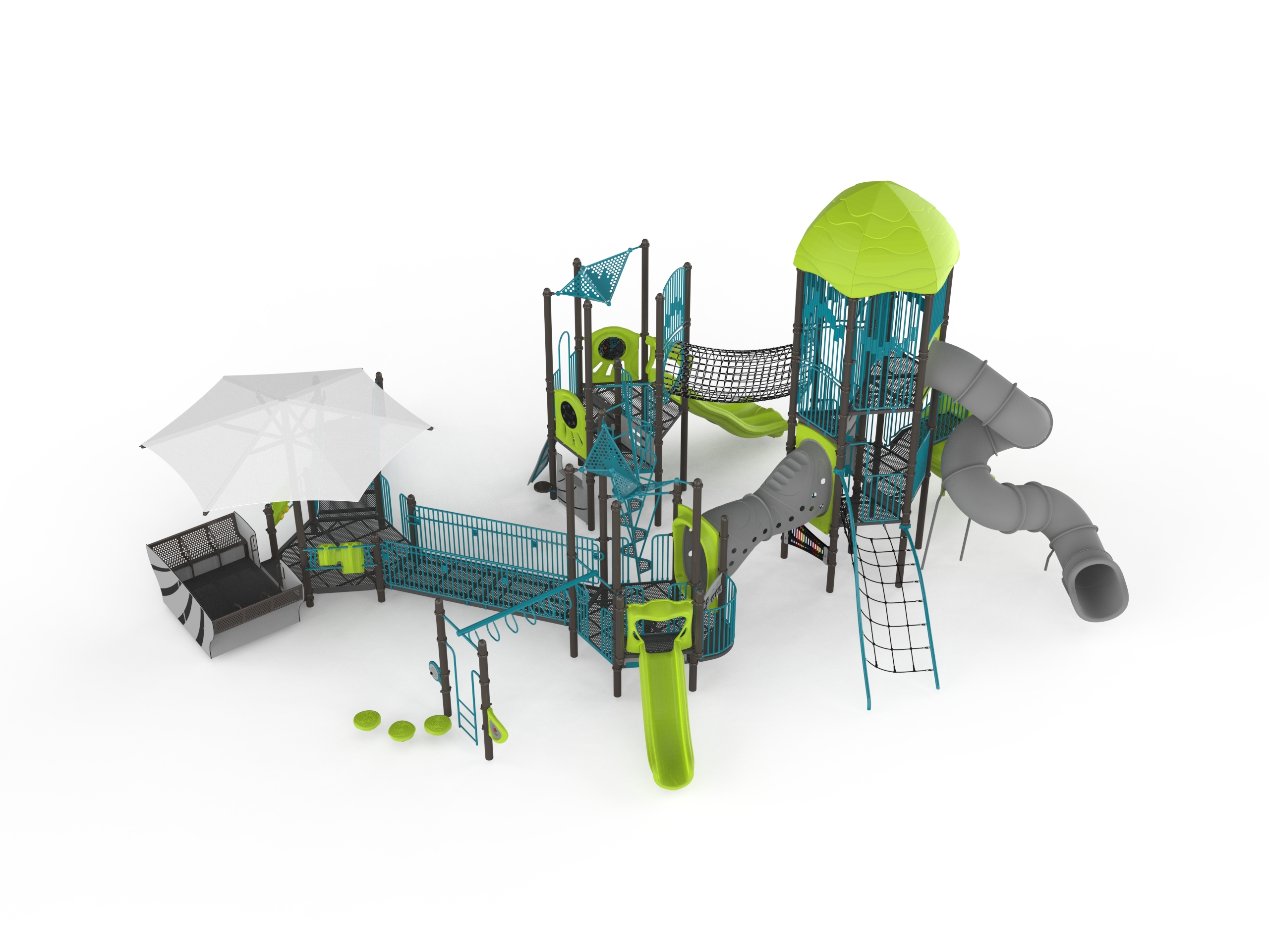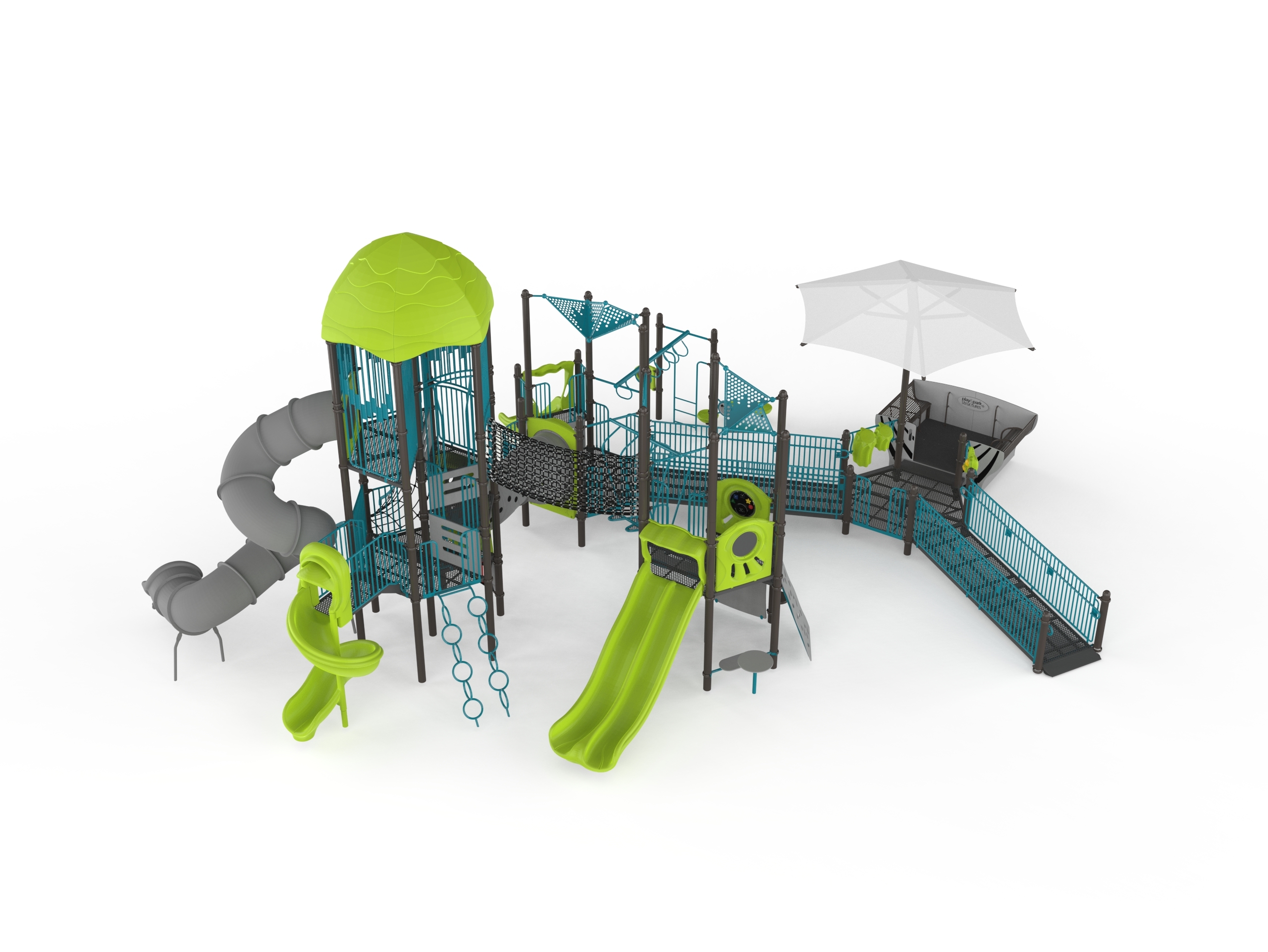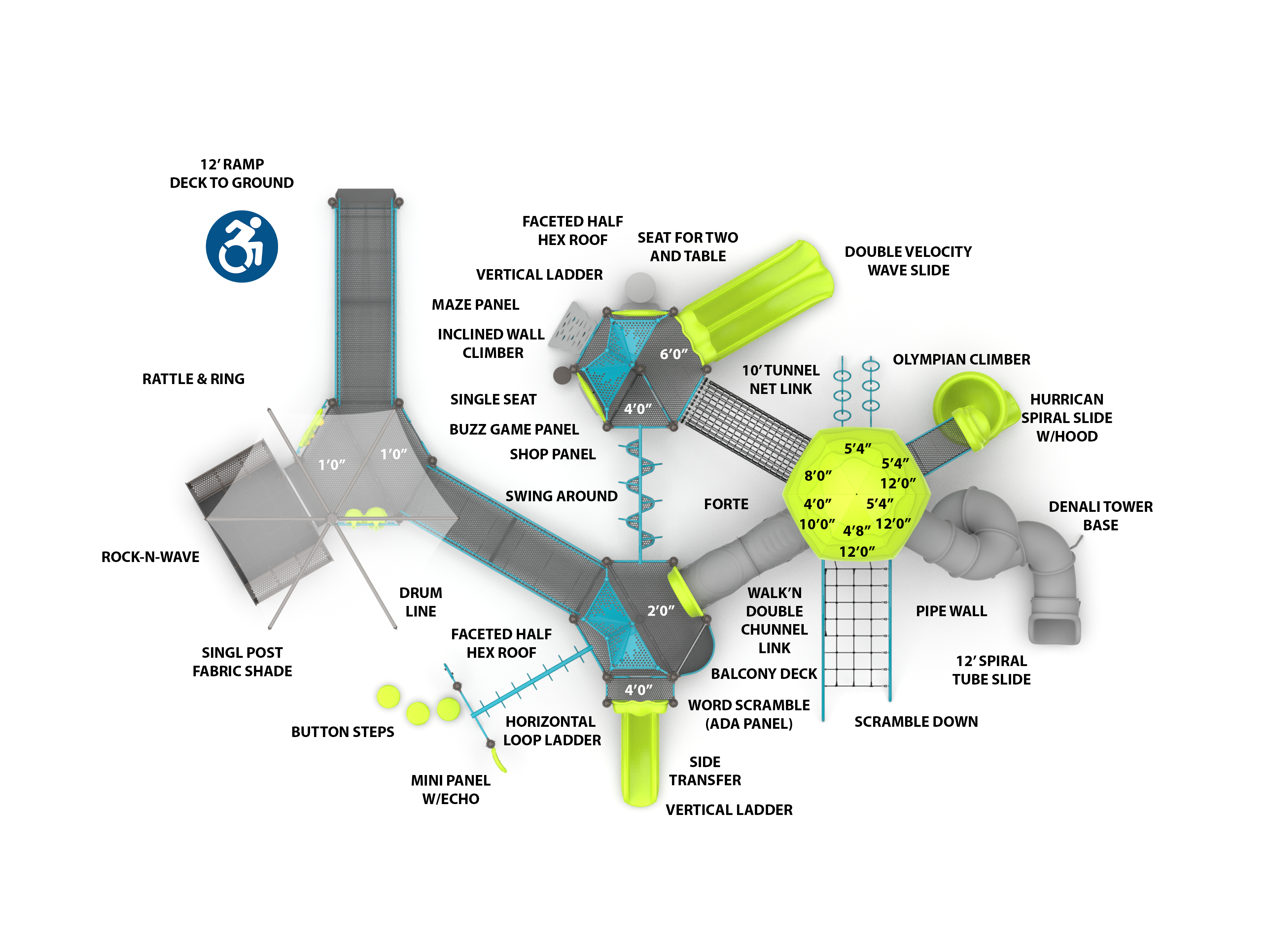 This inclusive structure offers multiple ground-level accessible activities as well as traditional climbing, sliding, swaying, and swirling fun. Pathfinder Peak is designed to support the physical, sensory, cognitive, social-emotional, and communicative development of all children, including those with disabilities.