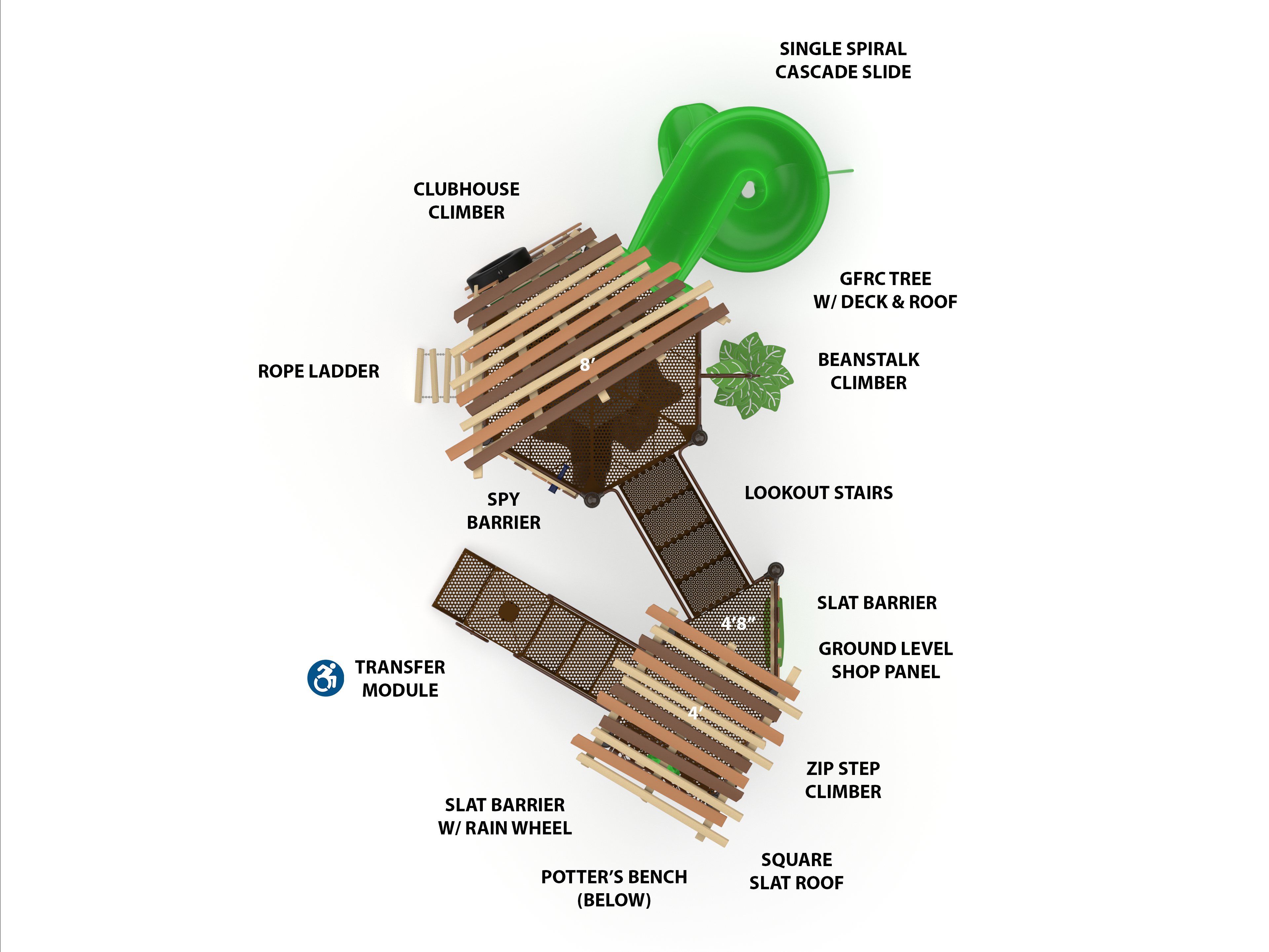 The Treetop Tower combines elements of a treehouse and challenge course adventure. The fun Clubhouse climber features a real tire offering a creative way to access the structure.