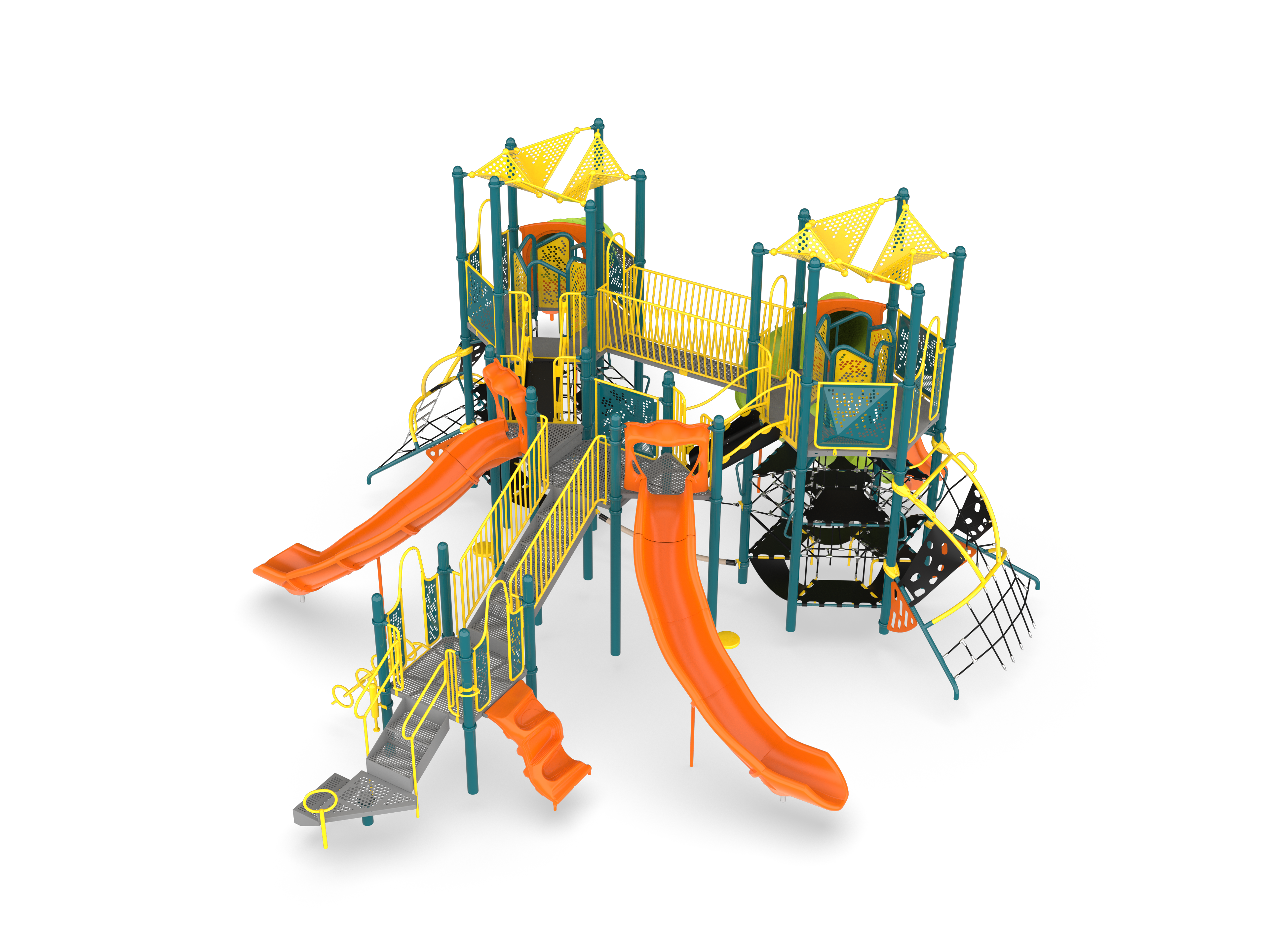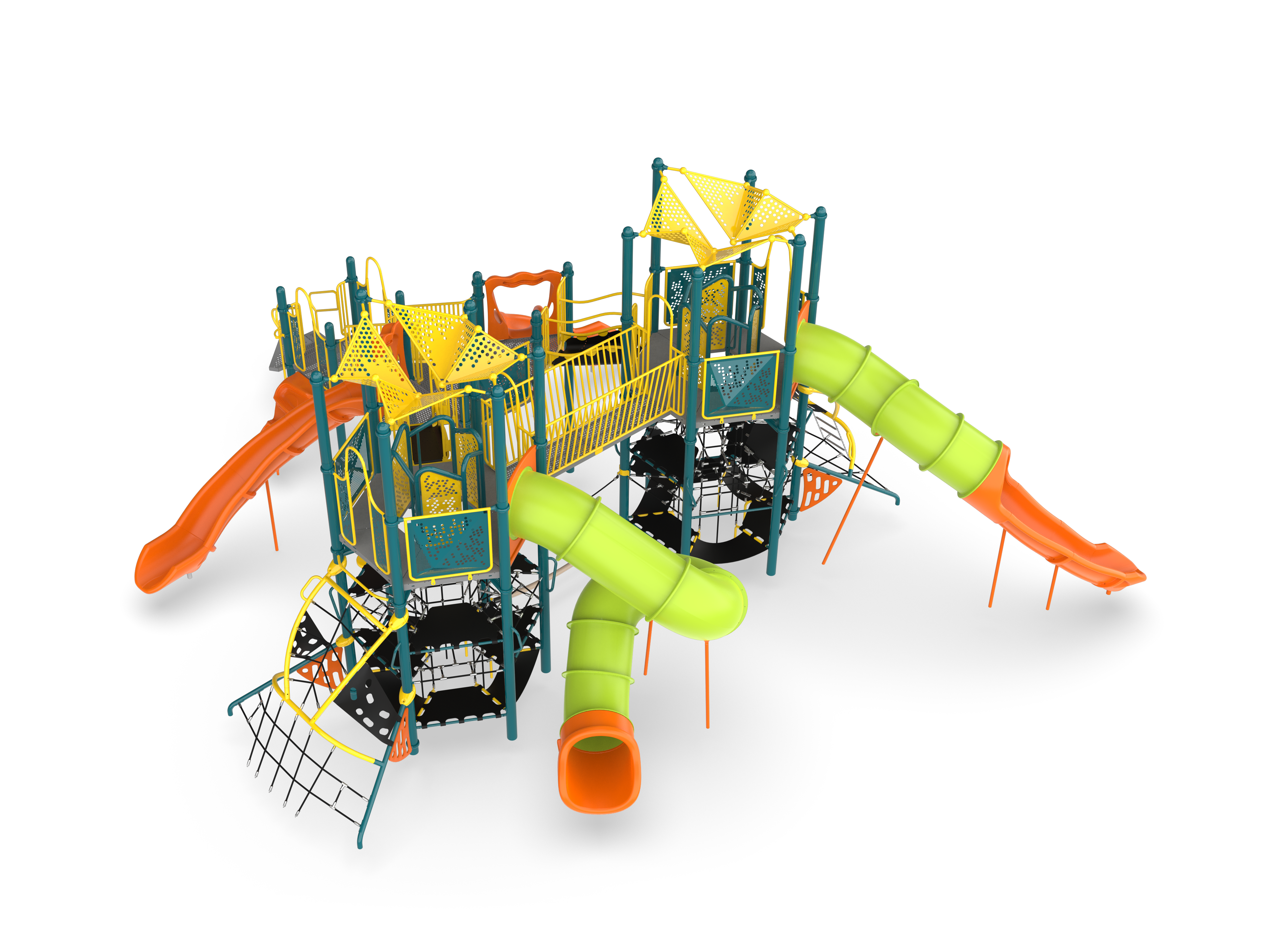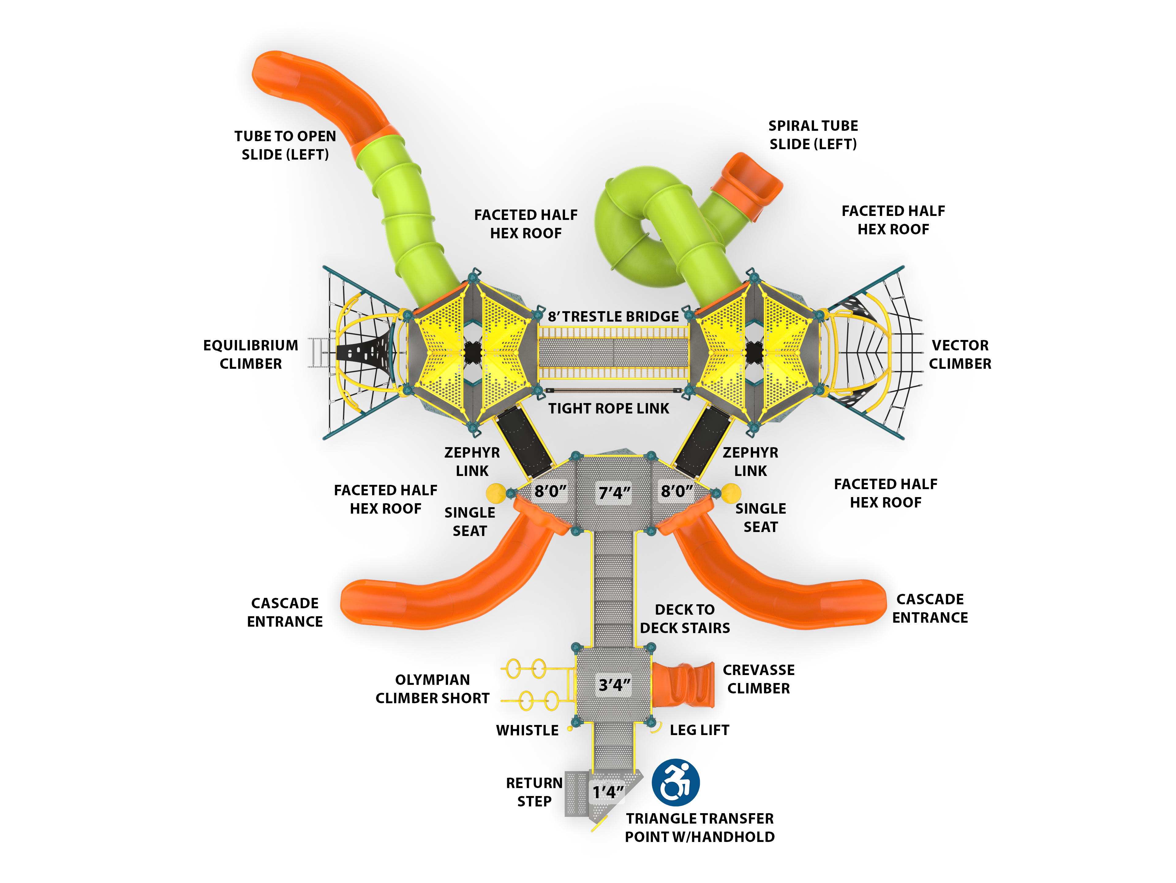 Virtually every type of exercise can be found at The Facility. This massive structure features two Hub+ Towers joined by a Trestle Bridge at the catwalks and then connected to a expanded hexagonal mezzanine by the new Zephyr links. From the Tight Rope Link to the Olympian Climber, everything about The Facility is designed to improve agility and core strength...but the kids will be too busy having fun to realize they are getting stronger!