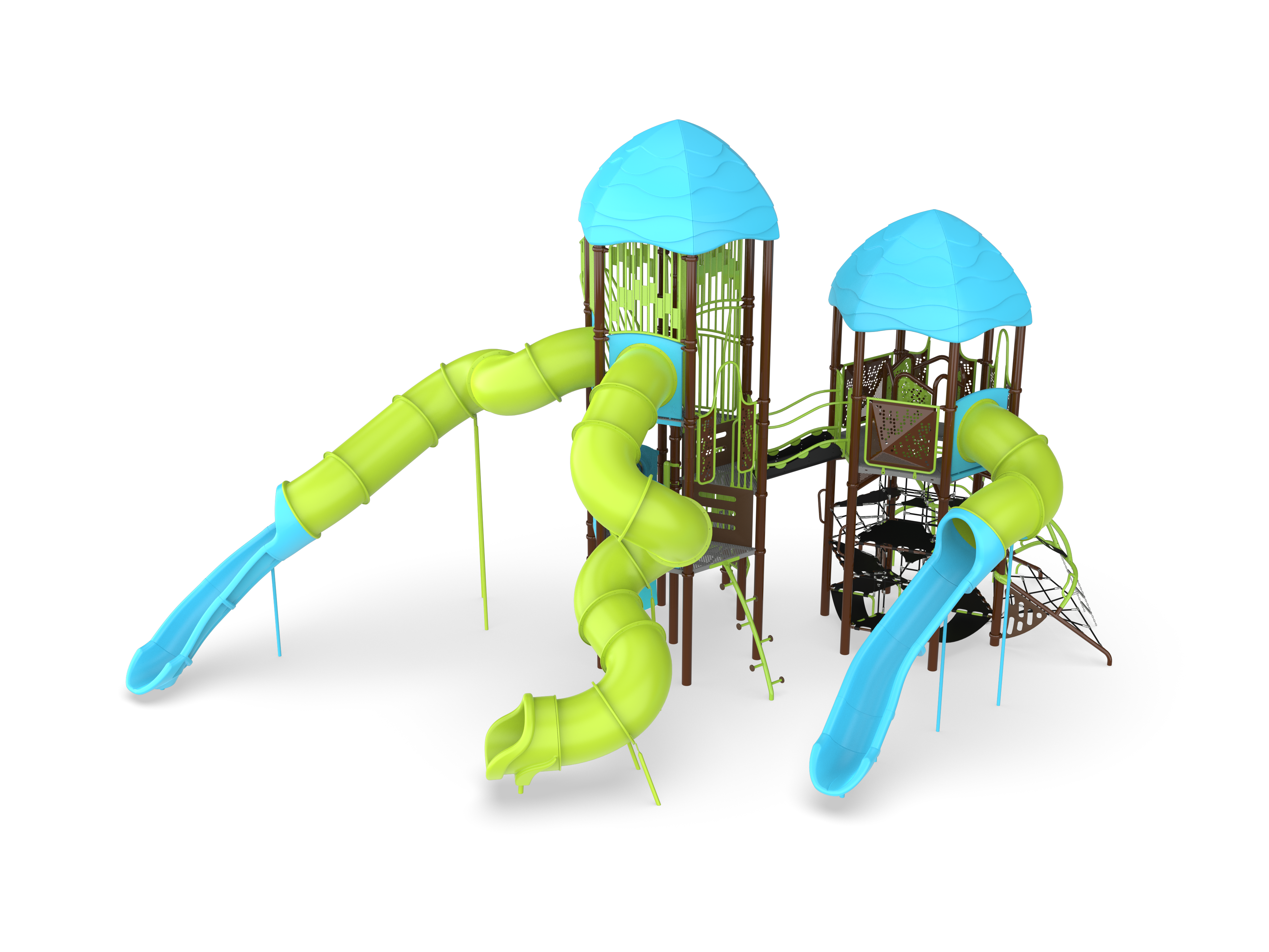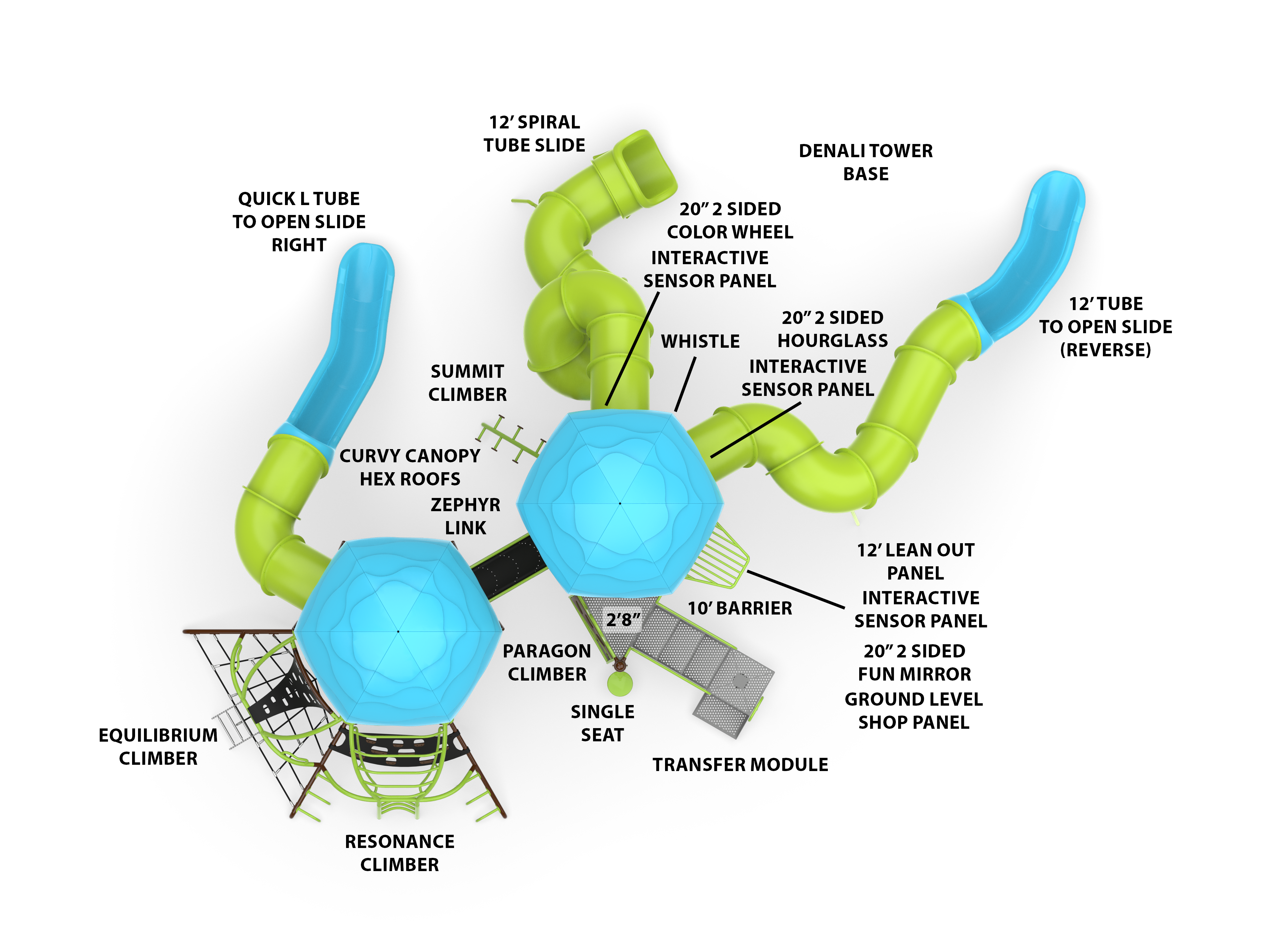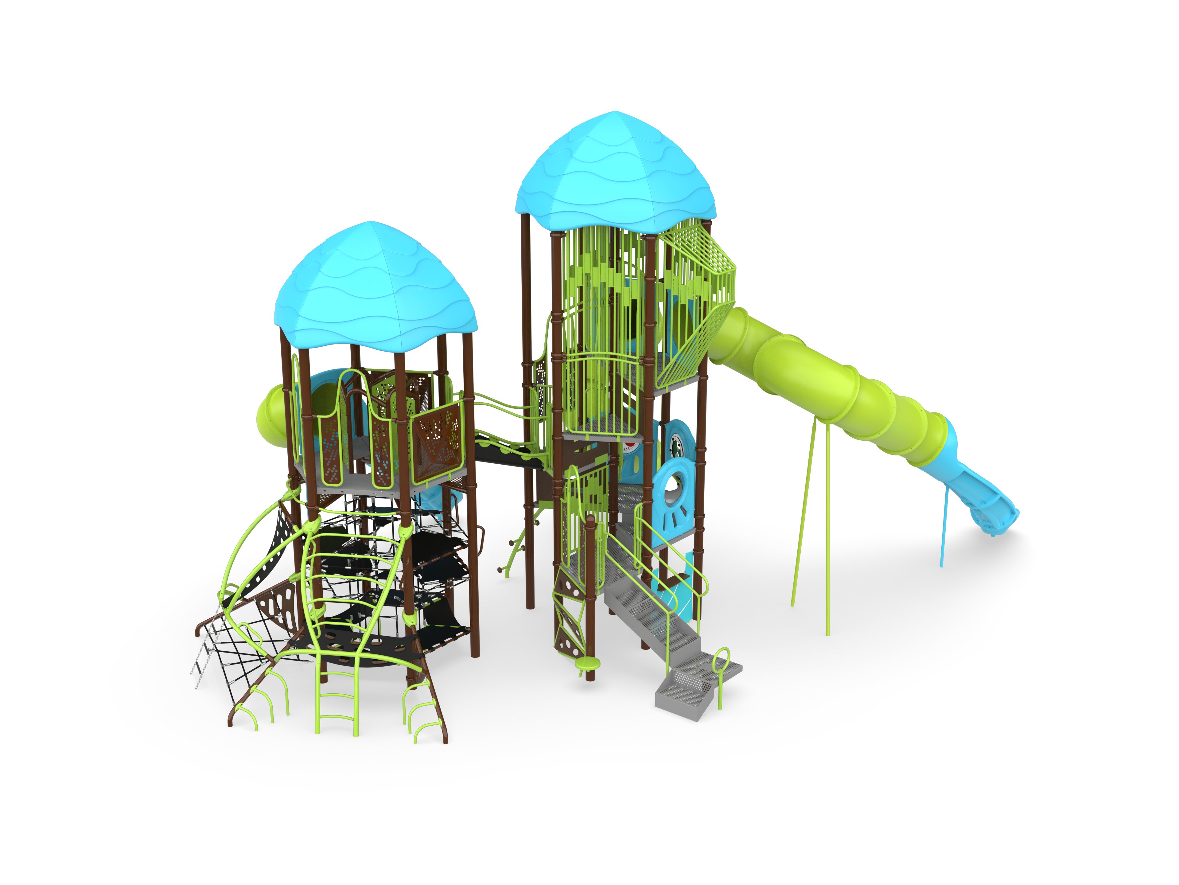 Do you have what it takes to conquer these giants? Of course you do! We linked a super-fun Hub+ with a Denali to create a pair of dominating towers of fun. The Hub+ Tower features both internal and external paths to the Lookout Catwalk and a Quick "L" slide for a dynamic exit. Cross the new Zephyr Link to the Denali tower and ascend to the stratospheric 12' observation deck. From there, you can choose which twisty slide to come down...and race back up to do it all again!