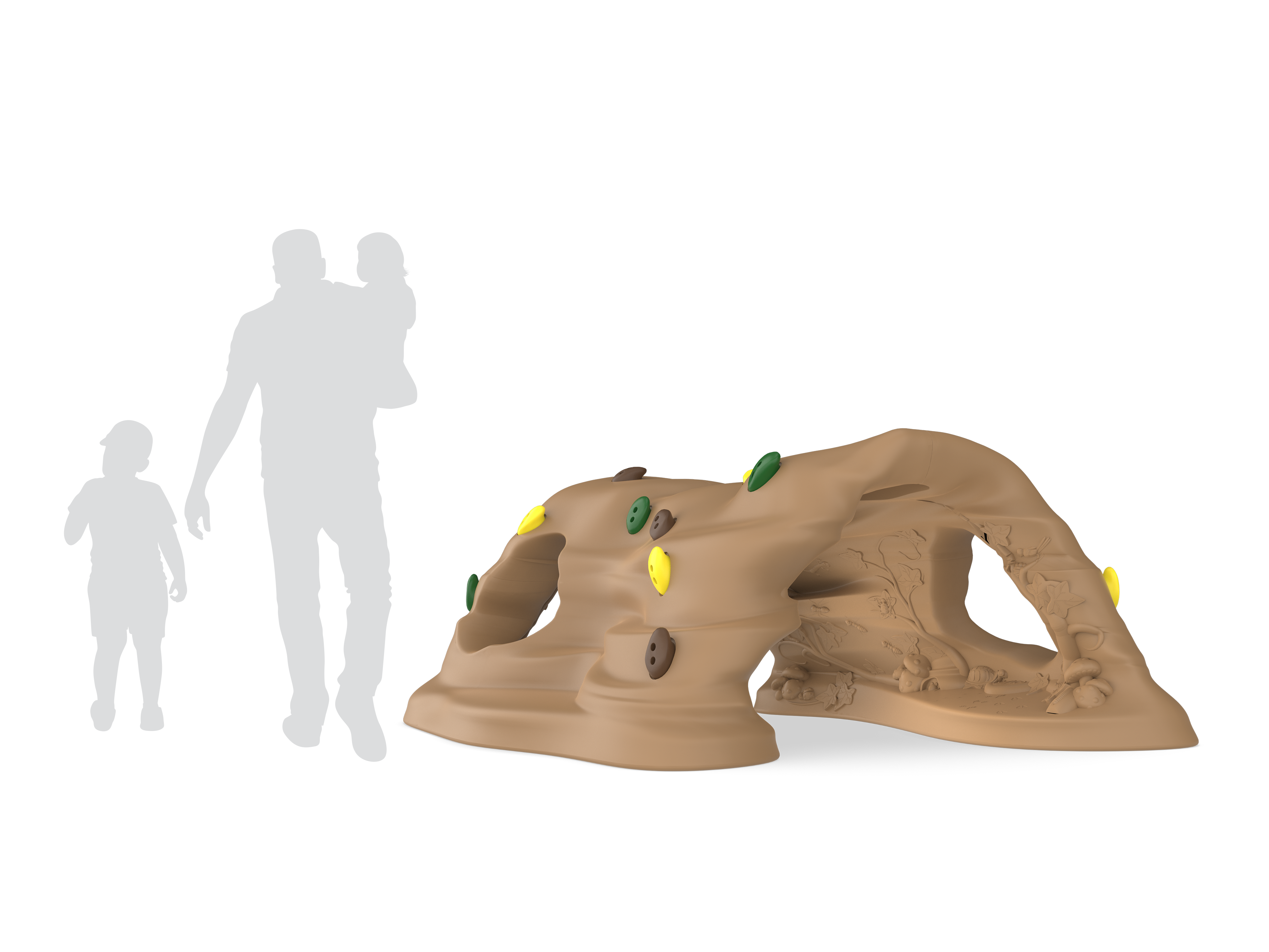 Introduce the wonders of both climbing and discovery with this novel climb and crawl adventure. Hidden wildlife, insects, footprints and foliage will delight and surprise youngsters as they navigate through the intricately designed cave space. The exterior provides challenging handholds that can be scaled from bottom to top and back again. Two separate seating areas provide spaces for rest or for even more in-depth exploration.
