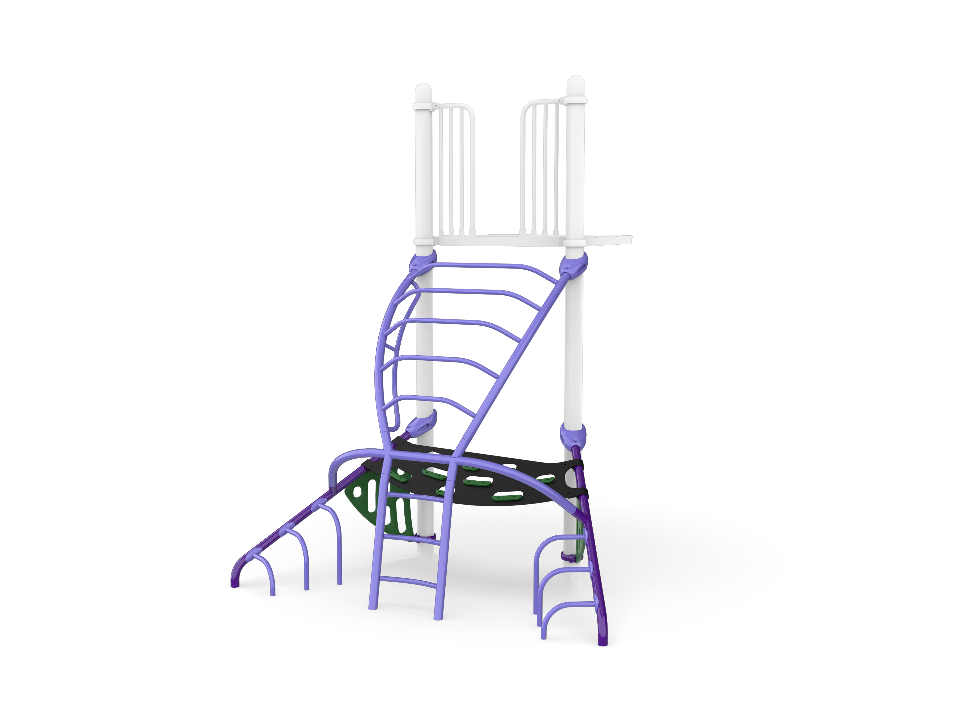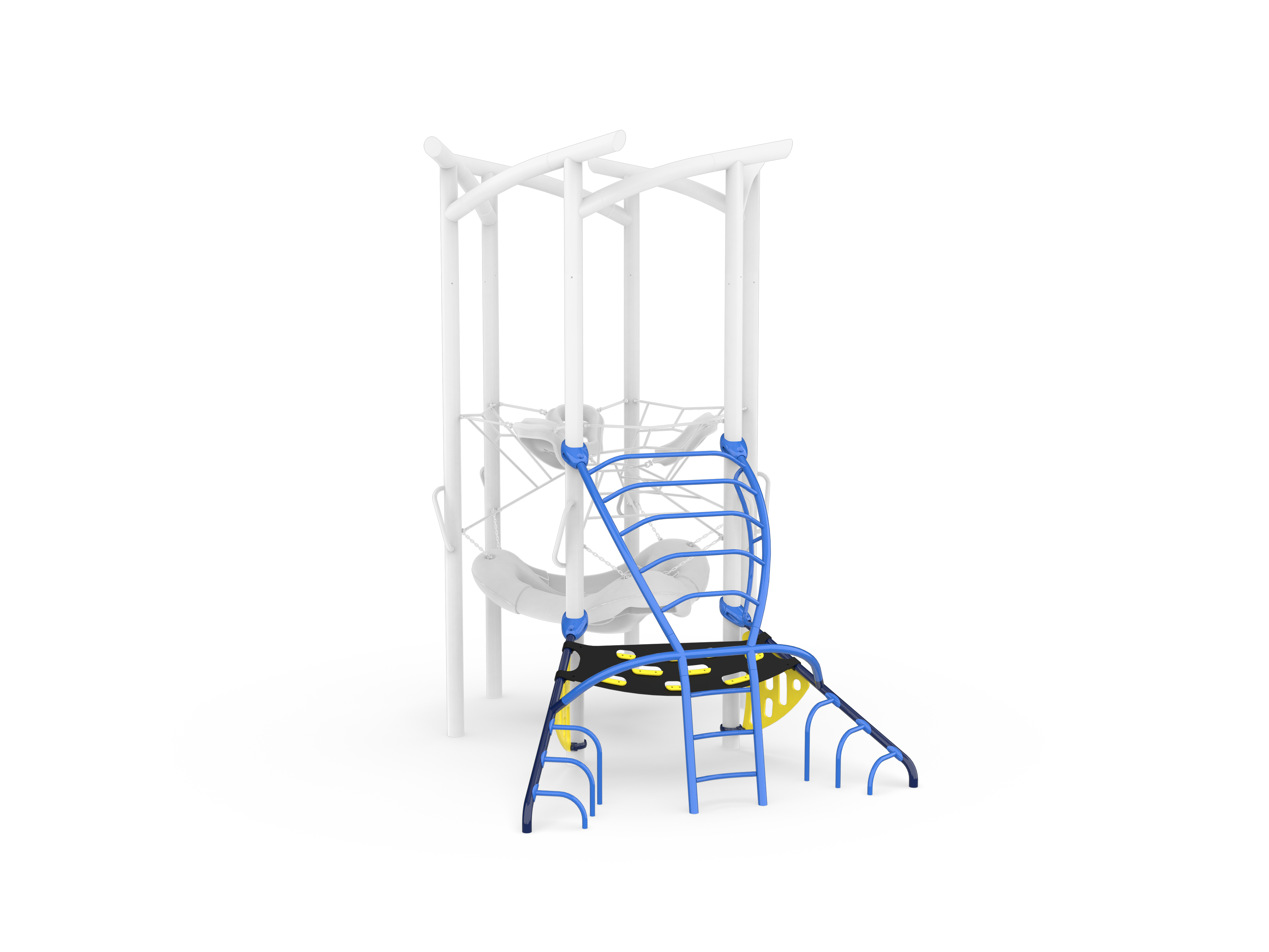 Convex-modified metal ladder creates a fast and exciting path to the upper net of the central Hub while slip-resistant belt and HDPE climbers offer unique pathways underneath for traversing around the Parallax structure.